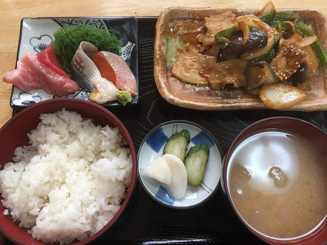 ♪ナス肉みそ炒めと刺身付定食¥880