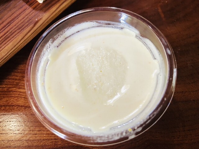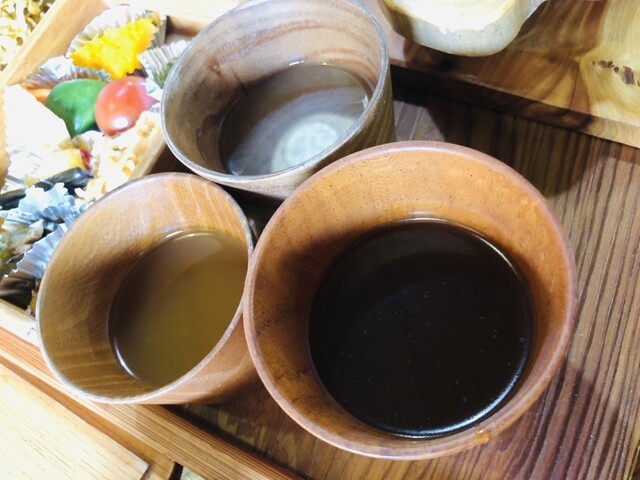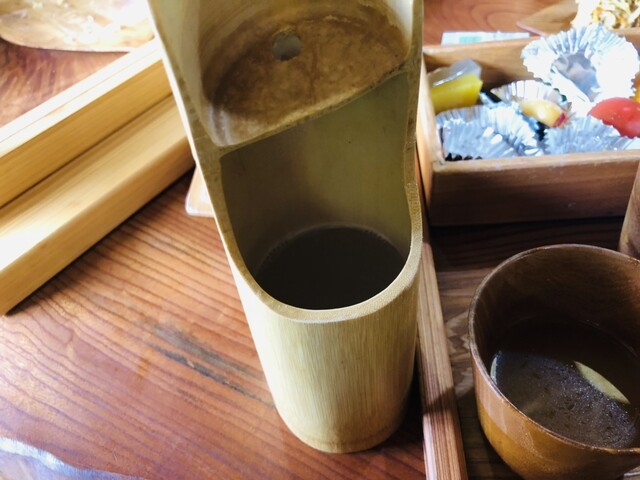 木の器のお冷を飲み干し