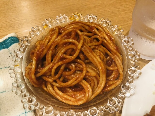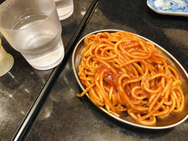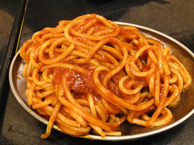 「私は、豚キムチ炒め定食にポテサラとナポリタン。」