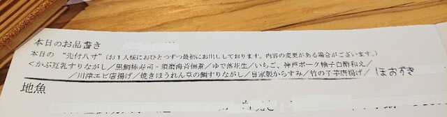 いつものコースに呑み放題をつけたプラン。で、お腹に余裕のある時には美味しい出汁巻きや、もち磯部揚げ、おにぎりなんかを追加したりしてますが今回は追加無しで。追加無しで済んだの多分今回が初めてかな?