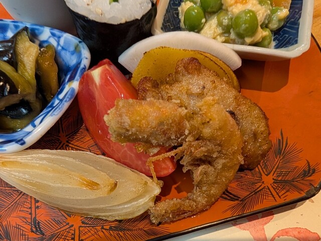 神戸トマト、新玉ねぎロースト、かわつ海老唐揚げ、うすいえんどう豆たまごとじ、自家製からすみ、明石だこさつまあげ、ビーツすりながし、かっぱ巻き、茄子辛子づけ
