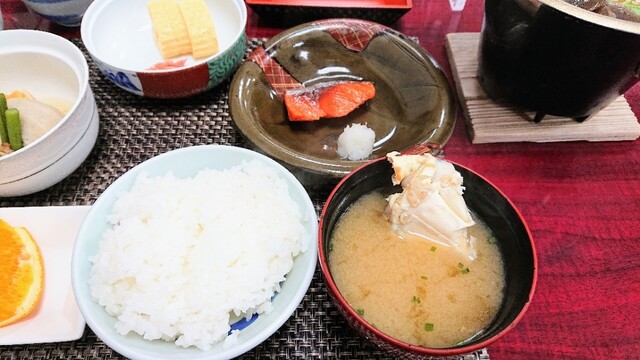 豪華な朝食という程でもないけど、少量ずつ色々とおかずが豊富◎ご飯&蟹の味噌汁が美味しすぎておかわりしちゃいました~(。・ω・。)ノ♡美味しくご飯がいただける事に感謝°˖✧◝(⁰▿⁰)◜✧˖°