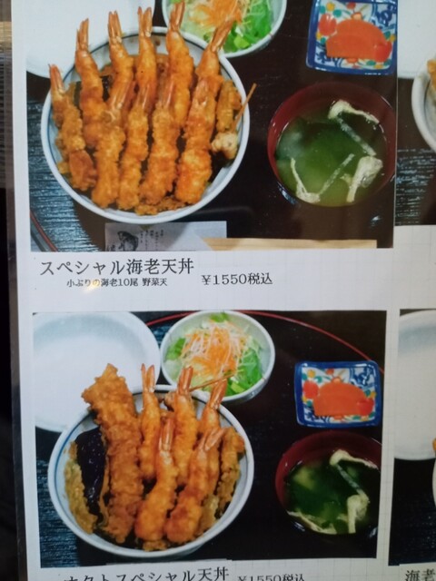 メニュー表ではスペシャル海老天丼特盛は御飯大盛になっているのだが店員の人が大盛か普通盛りかを聞いてきたので普通盛りにしてもらった大盛りだと残す可能性があったので