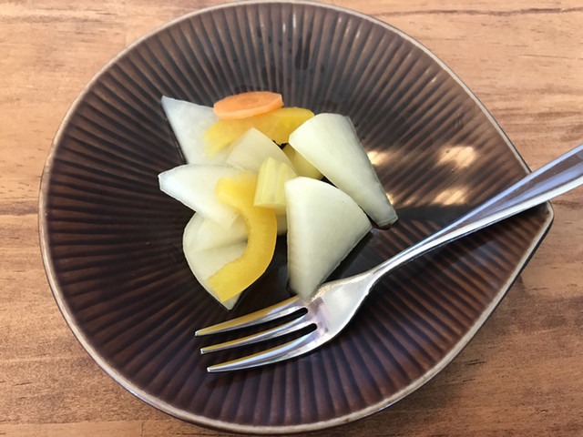 ピクルスは別皿での提供で、大根、ニンジン、パプリカ、セロリなど数種類の野菜を使った自家製のようです。