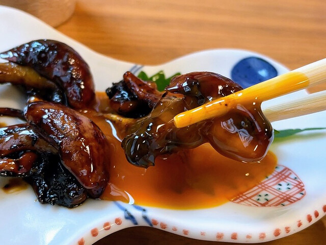 きもは濃厚なたれがからみ卵黄をまぶして食べる。臭みもなくつまみに最適。