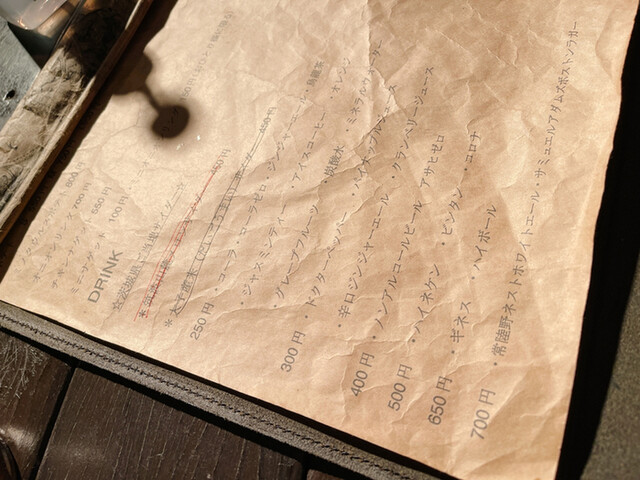 店は六本木ヒルズの麓。建物の地下にあり階段を下ると異空間が広がる。古いダイニングバーのような雰囲気。2人がけのテーブルに座り予約の確認とドリンクをオーダー。