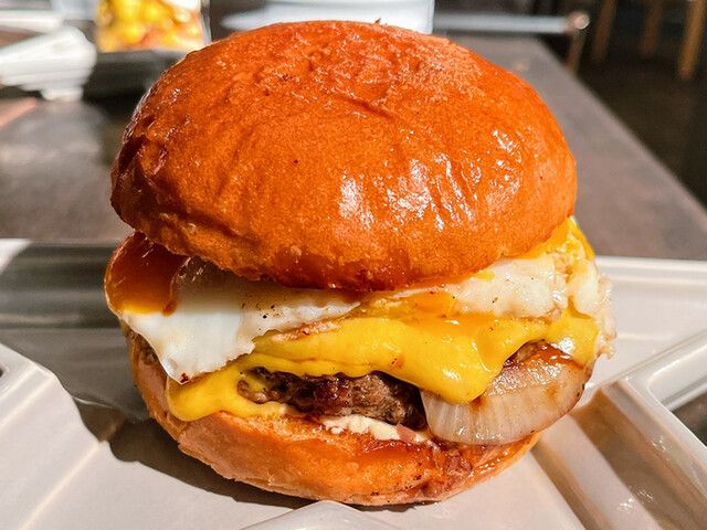 白い星型の皿の中央に鎮座するハンバーガーはまさに王者の風格。余計なものは無くバンズから目玉焼き、チーズ、パティ、ソースが一体となり隙間なくひとつの物体になっている。