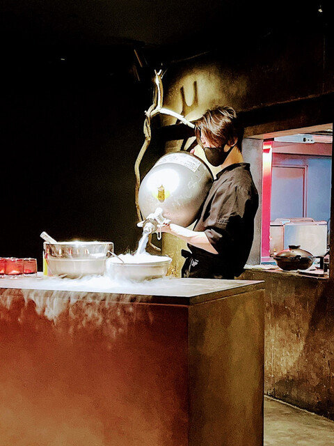 液体窒素で凍らせた殻をハンマーで割ると中からジェル状スープが現れる。