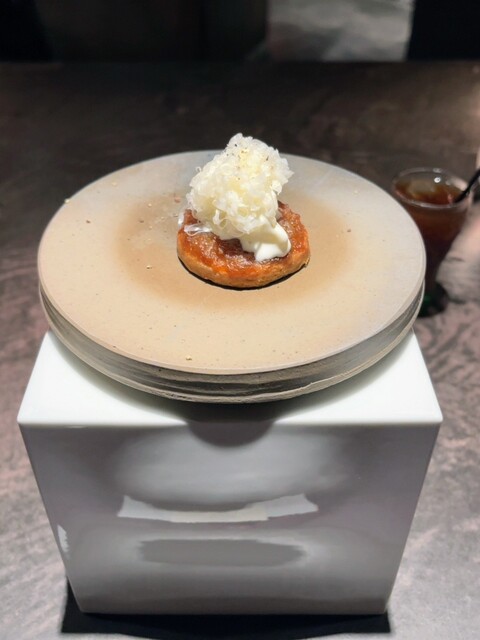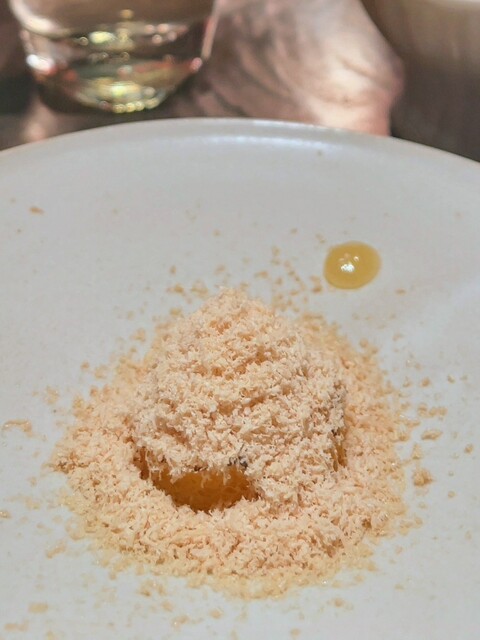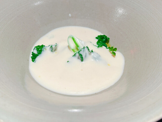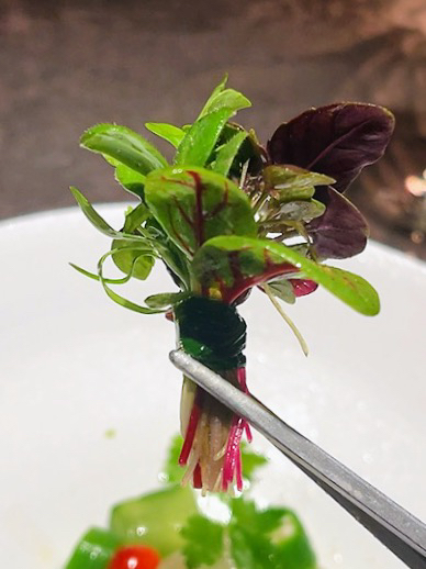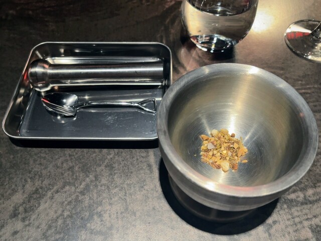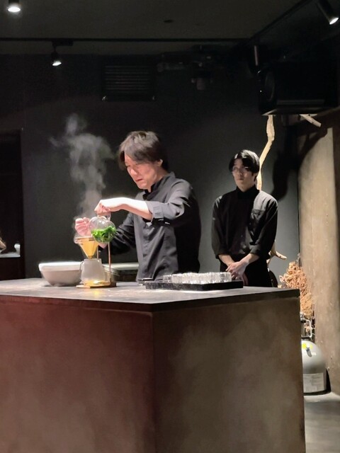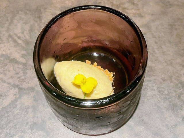 〇ふきのとうのアイスクリーム。液体窒素を使用しその場で完成させる。上にはピスタチオと花。アイスはふきのとう独特の苦味と甘味を楽しめる。最後にグラスの底にある黒蜜と混ぜながら。
