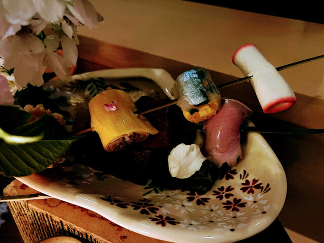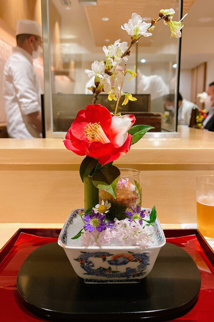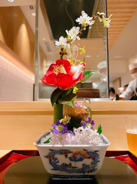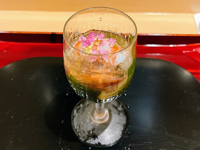 花祭りにちなんで椿と桜の花等をあしらった先付け。ジュレで味付けられている。