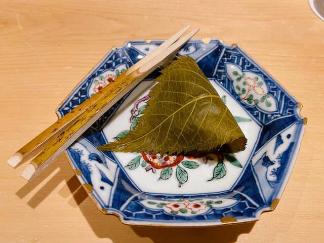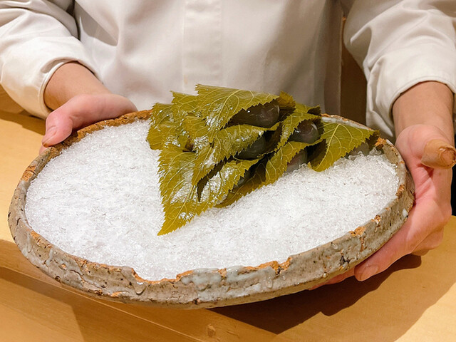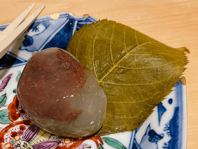桜の香りと共にいただく葛まんじゅう。葉の香りも一緒に楽しむ。