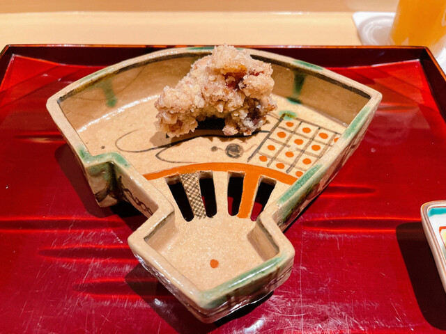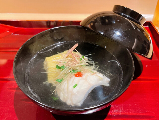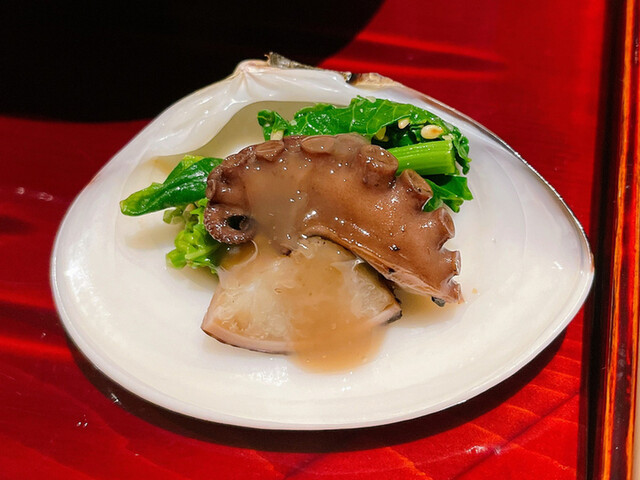 冷たいものが多いなか胃腸を温めるために、ここで温かいお椀。コリコリしたオコゼの胃袋。医食同源、胃袋を食べて胃を強くするとの事。