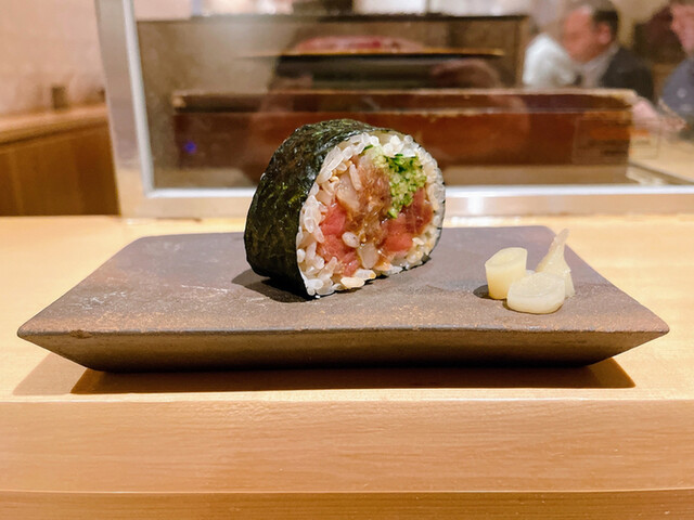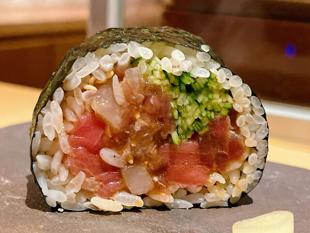鮪三種を貴重な海苔で贅沢に巻いた巻物。