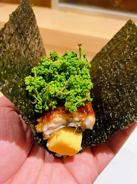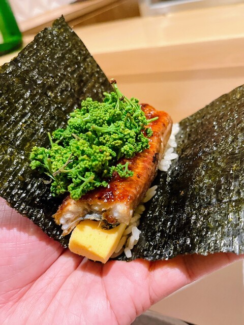 選りすぐりの鰻は炭火でじっくりと焼き上げられる。上質な海苔の上に玉子しんじょう、鰻、花山椒と積み重ねられる。