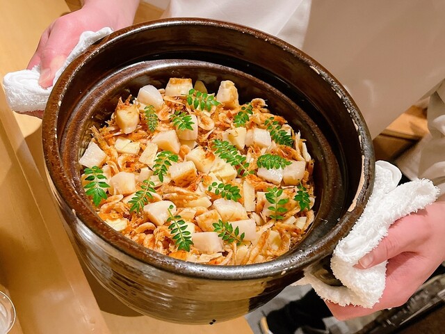 海老のパリッとした食感と風味がホタテの旨味を閉じ込めたご飯が奇跡のフュージョンを生み出す。