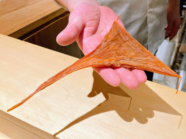 引き締まった鯛の弾力のある食感に煎り酒が纏う。海鼠の卵巣から作られる三味線のバチのような形のばちこ。酒の肴に最適。