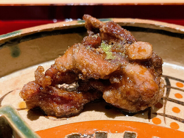 タレで味をつけた竜田揚げ。スッポンの弾力のある肉感が食べ応えを感じさせ、揚げられた衣の中には旨味が凝縮。途中ですだちを絞って爽やかさを演出。スッポンの美味しさを改めて実感。