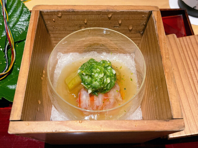 ・賀茂茄子の油煮、車海老、雲丹、オクラと長芋を叩いた青とろろ、餡掛け