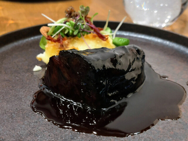 煮込まれた赤ワインソースの濃厚な味わいに、人参のピューレが優しい甘さを加え、これもまた絶品のソースが仕上がる。