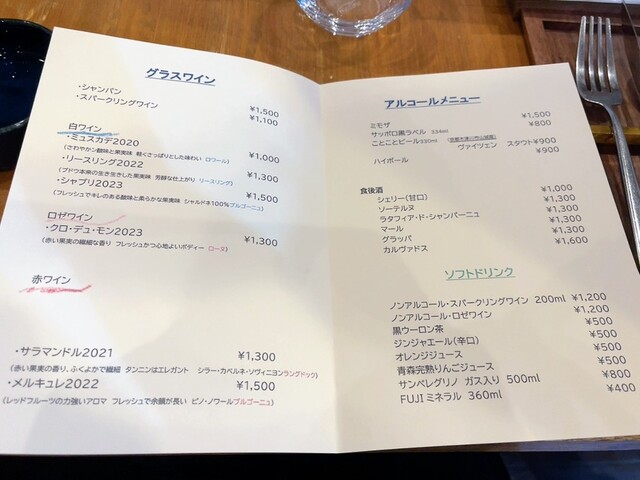 シェフと奥様からご挨拶をいただき、飲み物とメインをお伝えする。