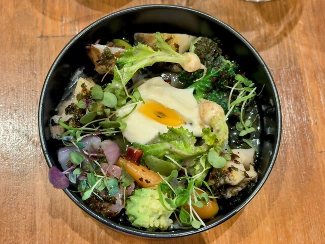 人参の葉を織りまぜたサラダが深みのあるビターなソースを軽やかに。