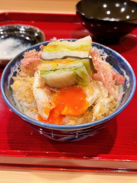 半熟玉子の天ぷらに香り高い削りたての鰹節。