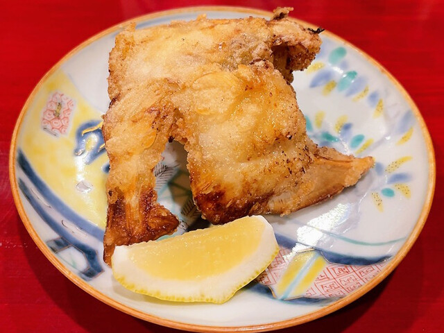 大きなふぐの唐揚げは骨の周りに付いた身が美味。