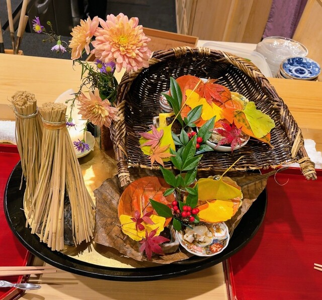 紅葉,銀杏,柿の葉,菊,南天、みの籠,雪囲いをあしらった季節感満載の八寸。