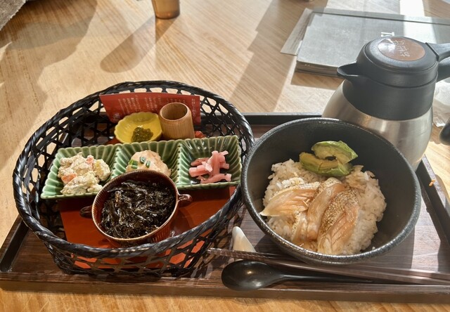 あけましておめでとうございます今年は築地本願寺で初詣。約30分待ちで窓際の日当たりの良い席に。私は炙りサーモンとアボカド鯛出汁茶漬け。次男はチキンの大葉タルタル南蛮。デザートは抹茶の濃厚テリーヌどちらも美味しくいただきました