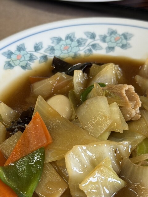 どなたかの口コミで八宝菜でご飯3杯はいけるという記事を見たので、八宝菜を。相方はモツの入ったスタミナ定食を。スタミナ定食を頼む方が大半でした。人気があるのでしょう。八宝菜は着丼した時、うずらが入ってなかったので、安く提供してくれてるから仕方ないか…と、思ってましたが、食べ勧めてくうちにひょっこり出てきて、嬉しかったです。ライスもボリュームがありました。