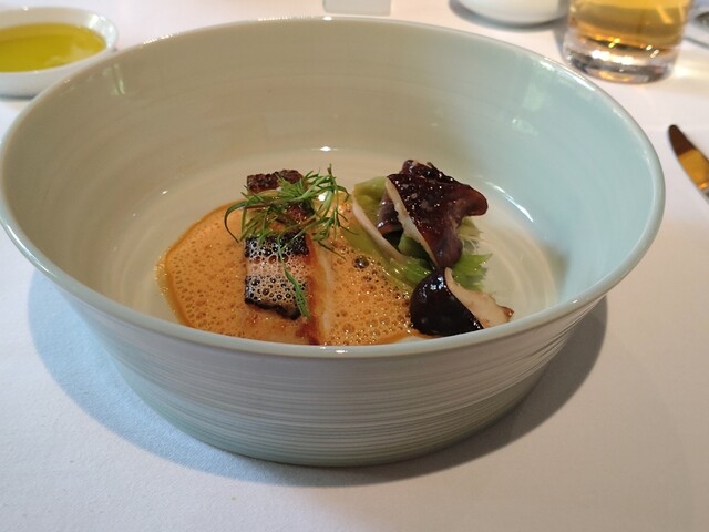⑤平鱸のポアレ 葉ゴボウと原木シイタケ ソースクリュスタッセ