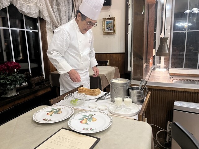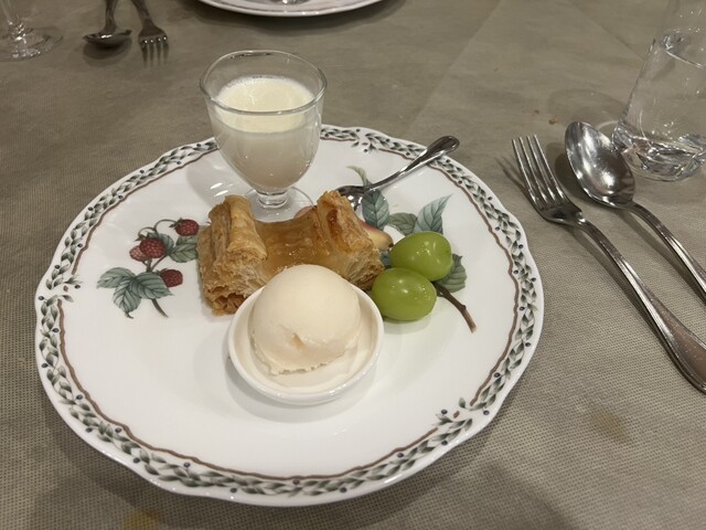 そしてデザートは、シェフ自らが目の前で、焼きたてアップルパイをカットし、パンナコッタとシャインマスカットを添えて提供してくださいました。