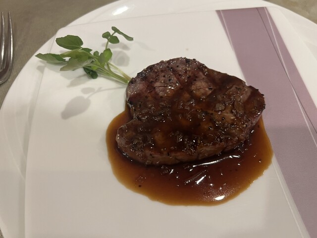 続いて、温野菜とフィレステーキ。ジャガイモはいったん潰したものを整形してから調理してあります。ステーキソースも絶品!