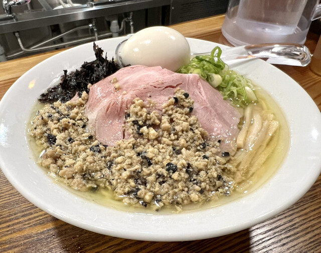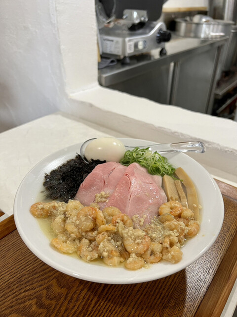 牡蠣塩ラーメンと炒りエビ和え玉(煮干しスープ)