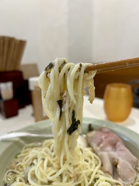 麺はやや中太で岩海苔と絡み合うことで別次元の美味さを味わえる。