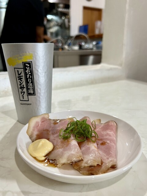 おつまみが無いとの事だったが、チャーシューで良ければと大判3枚をアテでいただいた。