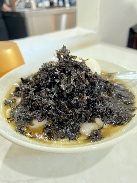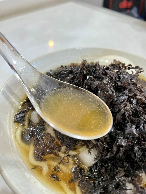 荒微塵切りの玉ねぎと大量の岩海苔とがスープと渾然一体となり唯一無二の味となる。