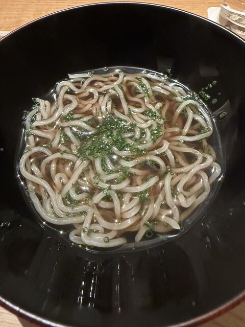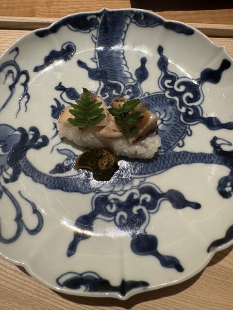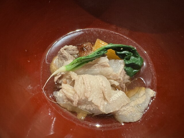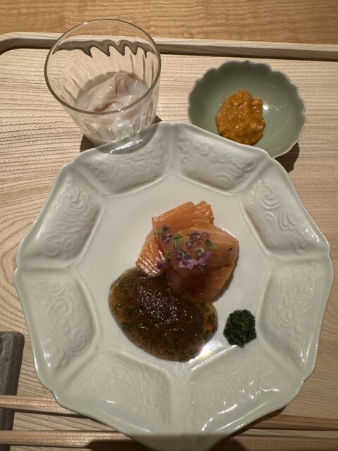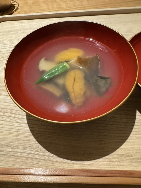 料理は、とうもろこしの寒天寄せ、稚鮎のダイブ餅米添え、雲丹と泡とオクラのお椀、水ダコのお造りの虎白ジュレとキャビアとナマコのくちこ添え、白甘鯛の炭火焼きと鴨茄子添え、穴子と白瓜、ハモとトウバンといんげん、虎白麺の納豆醤油がけ、白エビの炊き込みご飯、ココナッツアイスとじゅんさいのあずきがけ。
