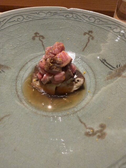 料理は白トリュフのおじや、真鱈のしらこ揚げ、松葉蟹のしんじょう、白甘鯛と虎白ジュレ(キャビアと香箱がに添え)、キンキの西京焼、原木椎茸にゴルゴンゾーラチーズとヒレ肉乗せ、クエとかぶらの煮物、虎白麺、九頭龍舞茸の土鍋ご飯、栗餅、葡萄シャーベットでした。