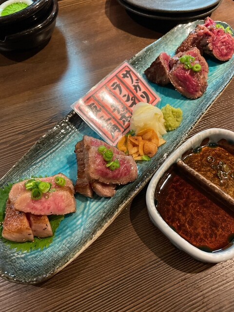 和牛タタキ風盛り合わせは友三角、イチボ、ランプ、サガリが乗っていてポン酢と醤油だれを渡され、どれも美味しかった。