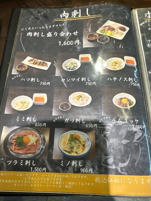 カイノミあつ、カイノミうす、ハラミあつ、ハラミうす、カルビ、焼きしゃぶはカルビが1番美味しかった。