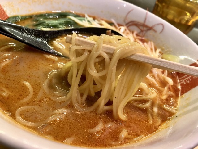 細麺の縮れ麺、この縮れ具合がスープとの絡み良くしてくれます。