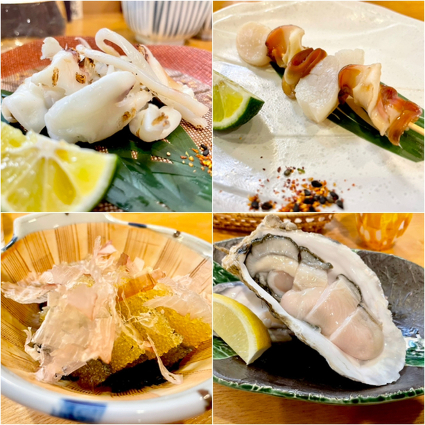 お通しは鯛のコブ〆、つまみは、毎度のげそ焼き(めちゃやわらかい)、生ガキ、