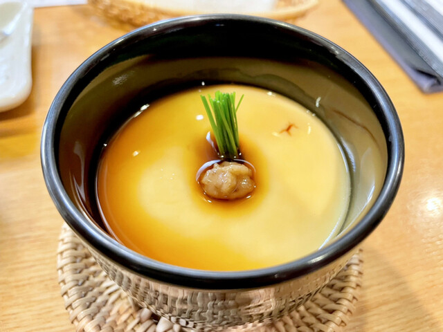 すぐに先付の茶碗蒸し提供です、TOPに梅ソース。