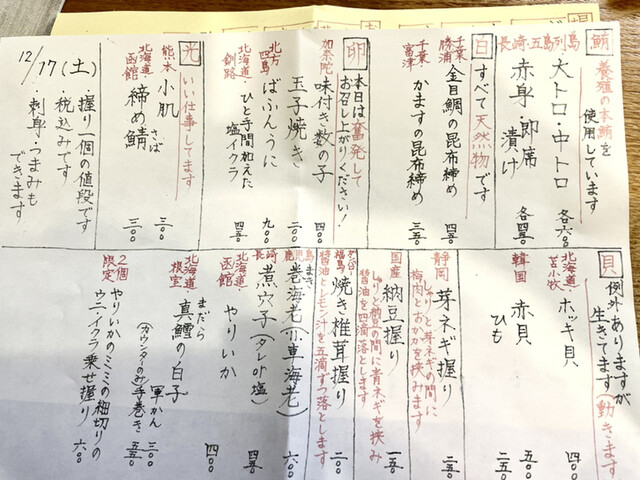 中トロ600円、のどぐろ550円、ばふんうに軍艦800円、