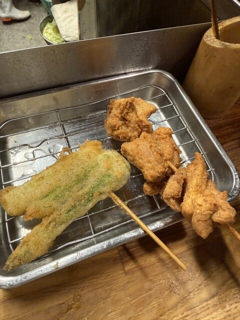 通常の串揚げとは異なり、唐揚げ用の粉で揚げている。