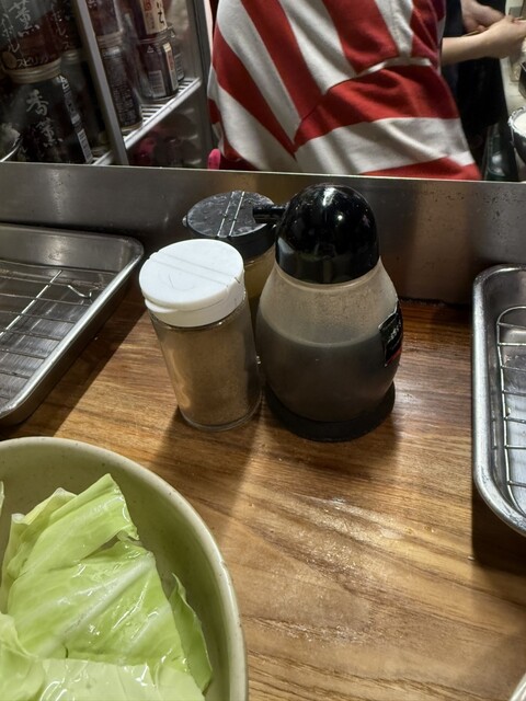 卓上にはソース、塩胡椒、カレー塩、ドレッシングが並ぶ。