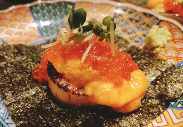 →ウニといくら乗ってるなんてきいてない!!(歓喜)しかもウニにうるさい2人が認めるおいしいウニ。でっかいホタテにこんなの乗せて980円は安すぎでは??