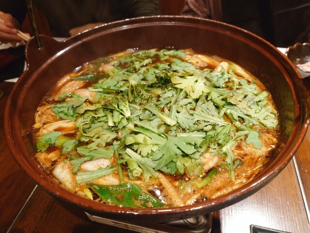 →春菊たっぷりのおなべ。猪の肉の香りによく合う。そして酒にも!