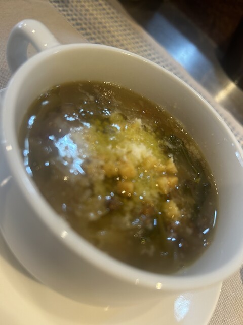 「野菜のスープです。かき混ぜて食べてくださいね」とこのとで、よーく見たら、スープの上にはカリカリチーズがバーナーで焼いてあるではありませんか!!んで、野菜とお豆パンパンに入ってる〜!